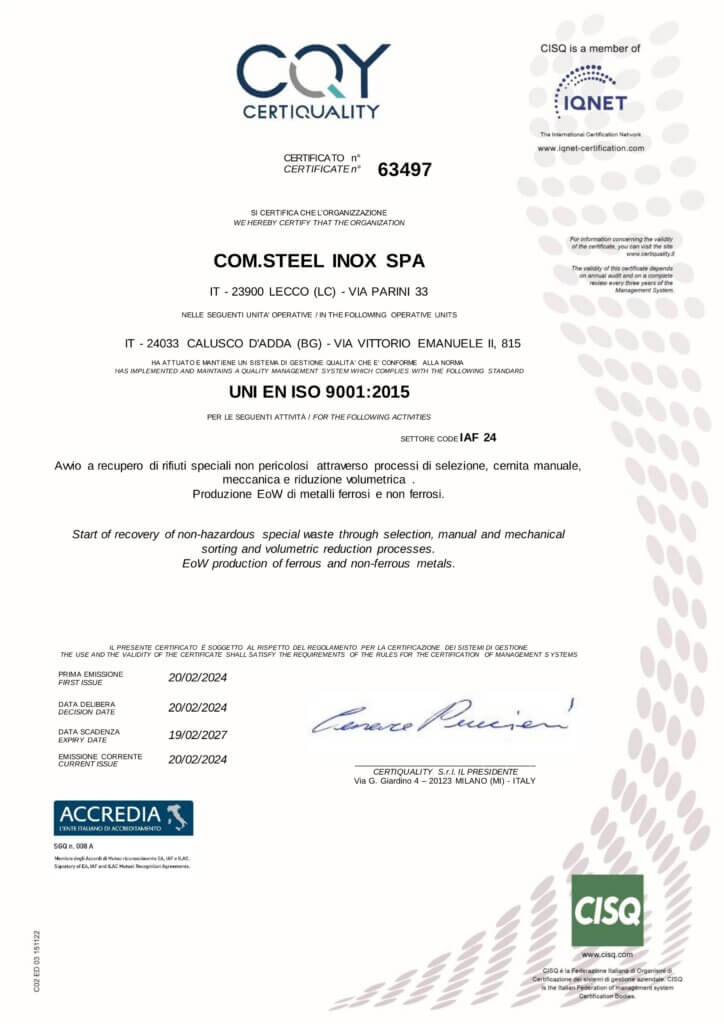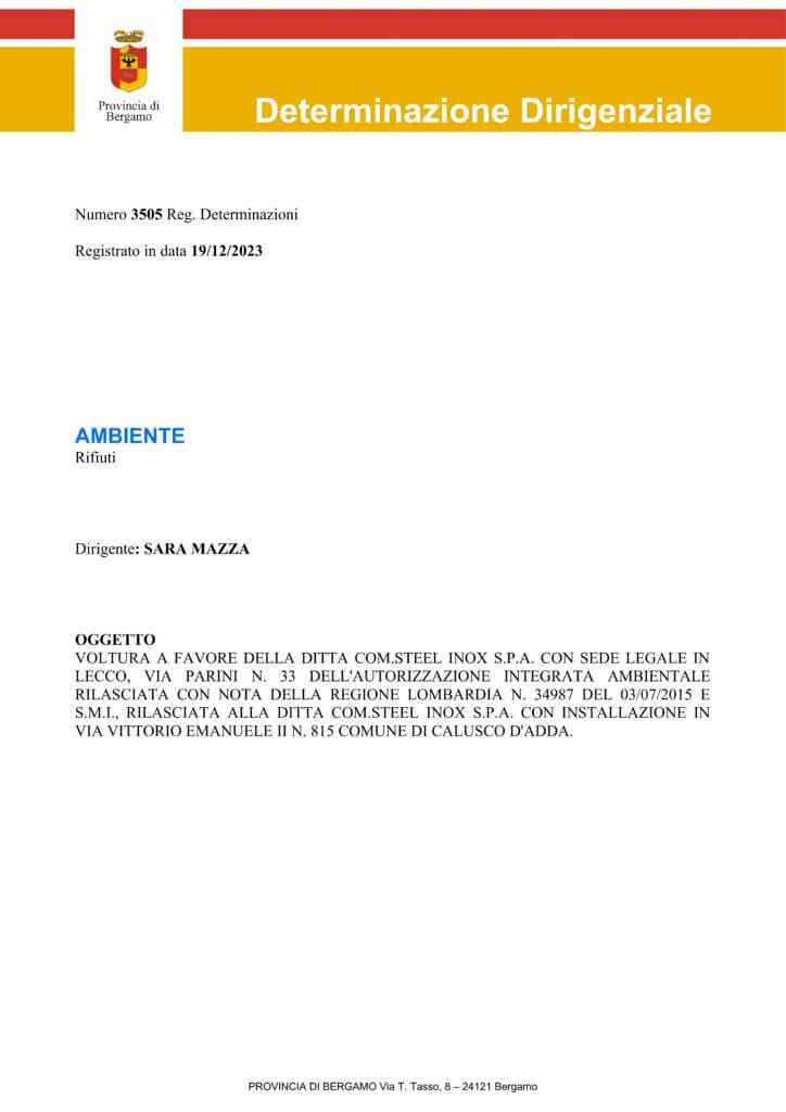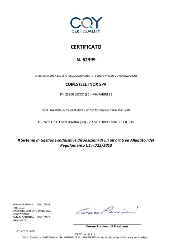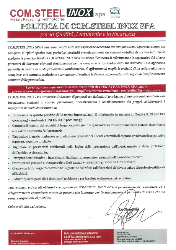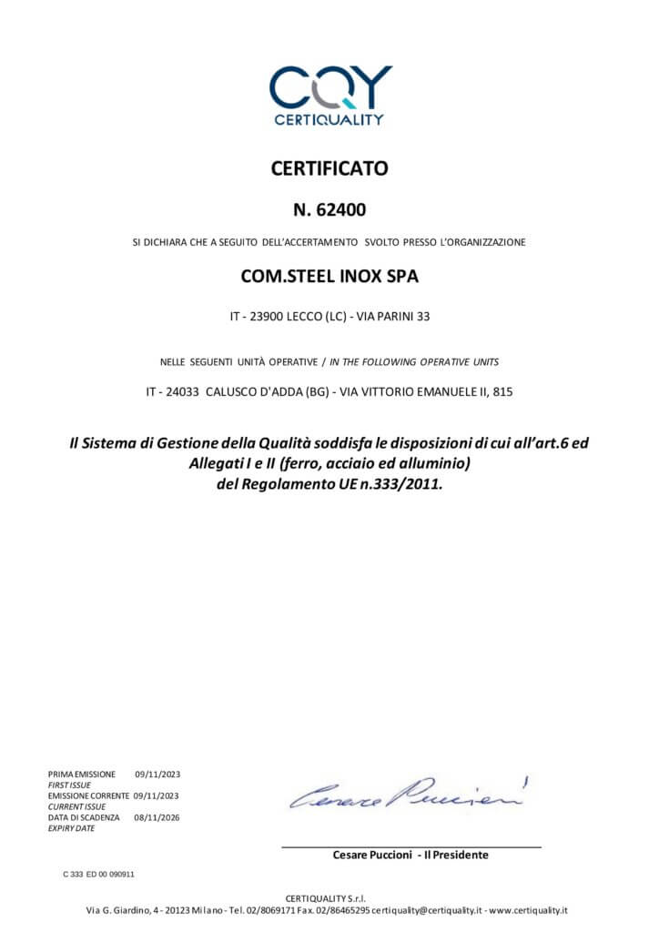 CERTIFICATO REG.UE N. 333 2023 CERTIFICATO REG.UE N. 715 2023 UNI EN ISO 140012015 N.63498 UNI EN ISO 90012015 N.63497 Brochure Com.Steel Inox Spa AIA-D.D.3086 DEL 23.12.2022 SC. 17.08.2034 + A.T. ACCETTAZIONE FIDEIUSSIONE POLICY Pensiamo insieme al futuro dell’acciaio Scrivici e struttureremo insieme il servizio su misura per te. Contattaci